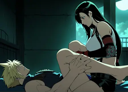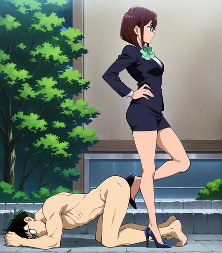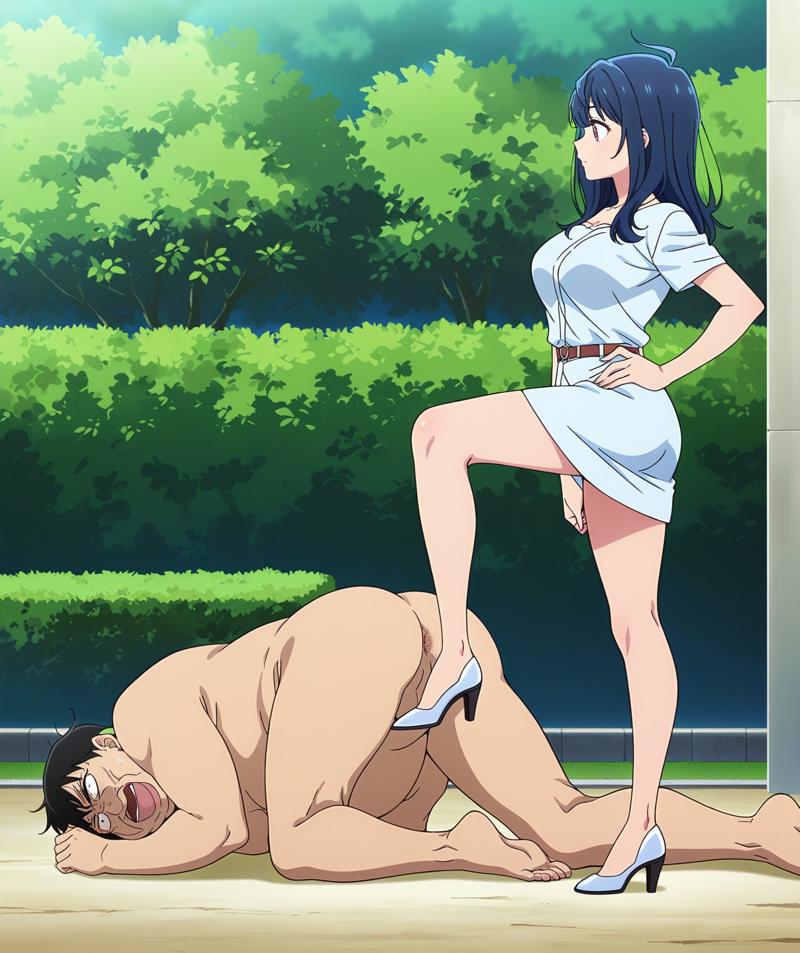 (하이힐이 남성의 엉덩이에 올라감, 엉덩이 밟음), 벌거벗음, 엉덩이, 1소녀, 1소년,