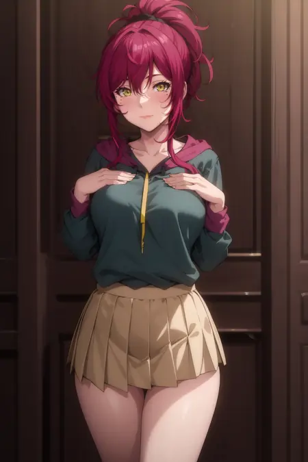 Madomiya Marie,1girl,solo,red hair,mole under eye,ponytail,bangs,yellow eyes,