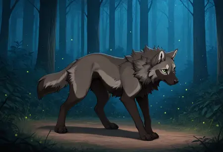 Wolf, feral, quadruped, digitigrade legs, black fur, grey fur, green eyes,