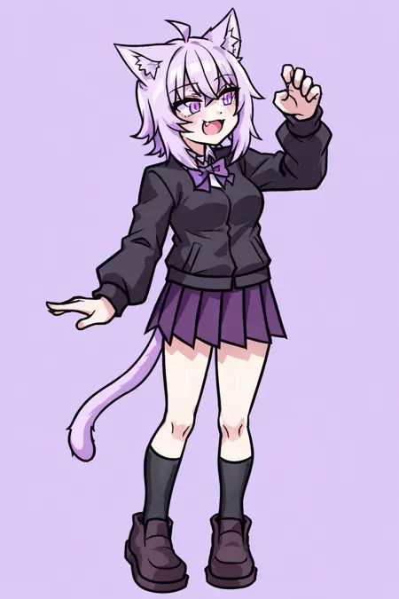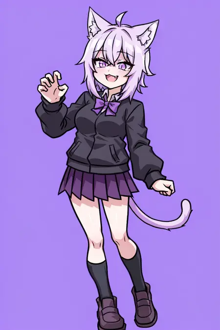 NekomataOkayuFNFHR, 1girl, lavender hair, catgirl, black jacket, purple pleated skirt, purple bowtie, purple eyes, fang, nekomata okayu,