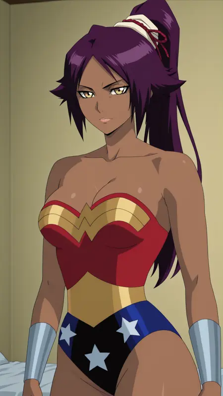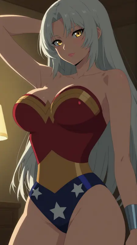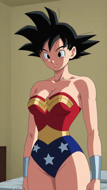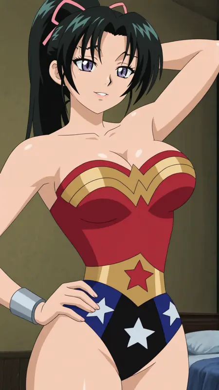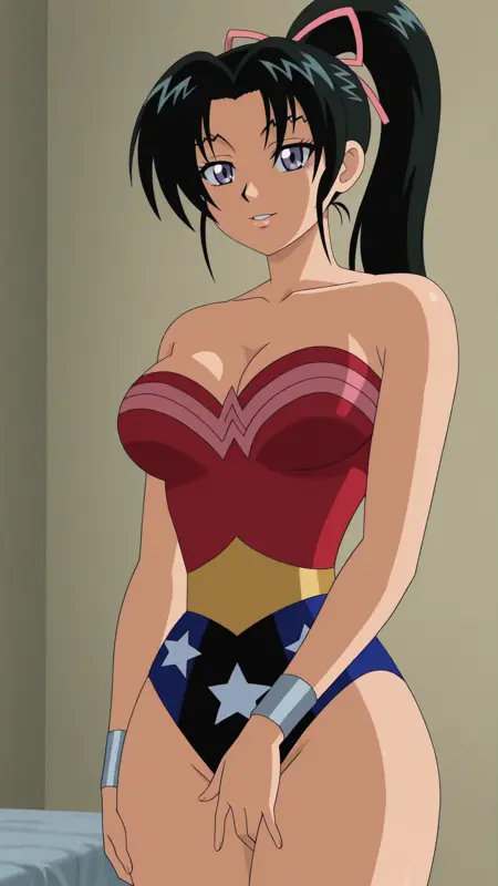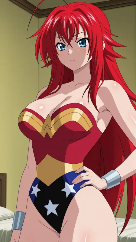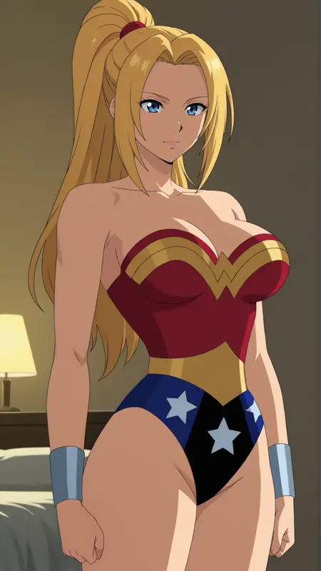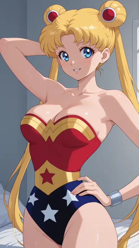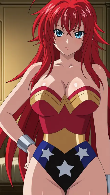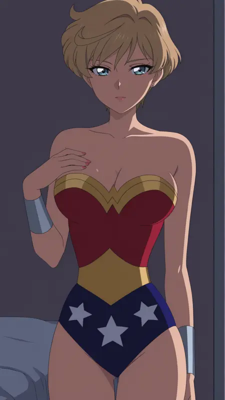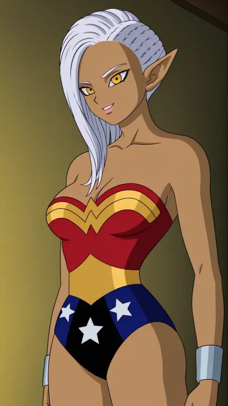 WW_JLU, star (symbol), tiara, superhero, leotard, two-tone leotard, red leotard, blue leotard, star print, star print leotard, silver bracelets,