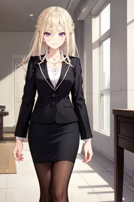"马尾辫,侧发,项链,正式,黑色夹克,铅笔裙,西装裙,黑色丝袜"