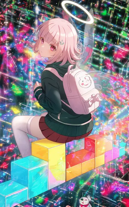 lora:Hyper-FLUX.1-dev-8steps-lora:0.125, lora:100danganpack-flux:0.5 , 100danganpack, lora:Nononononoway\_Style\_Flux:0.9, lora:Tsumugi\_Shirogane\_Danganronpa\_flux\_tags\_V2.01\_25e:0.8, A detailed anime-style professional illustration which features high quality anime digital art combined with detailed character design. Tsumugi Shirogane is wearing her uniform from Danganronpa V3. Tsumugi Shirogane has knee-length teal-blue hair parted in the center which is straight and smooth at the base and gradually splits into waves near the tips. Her eyes are large, round, and are a soft teal-green color. Tsumugi wears round, rimless glasses with white temples. Tsumugi's Danganronpa V3 school uniform consists of a white blouse with an orange bow tied at her collar underneath a two-button, pocketed, teal-black school blazer adorned with two silver buttons on each lapel and a single button on each gorge. She wears a knee-length teal-black pleated skirt with two dark teal stripes lining the hem. Her legwear consists of dark navy knee-length socks and teal-gray loafers. YOUR ACTUAL PROMPT