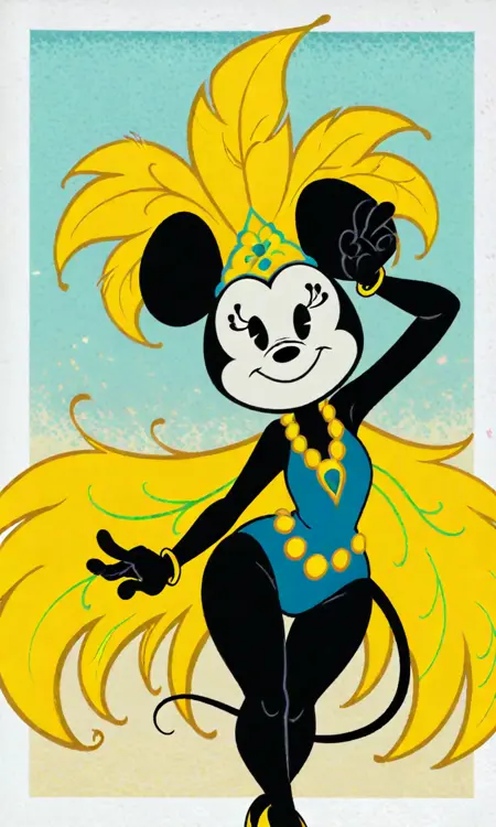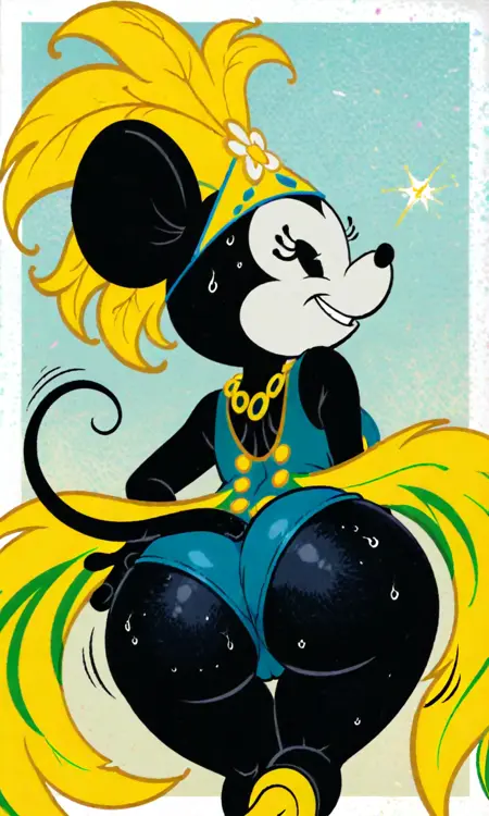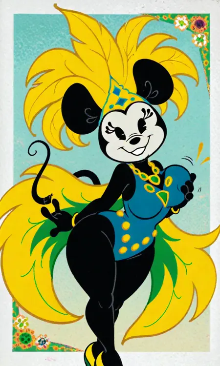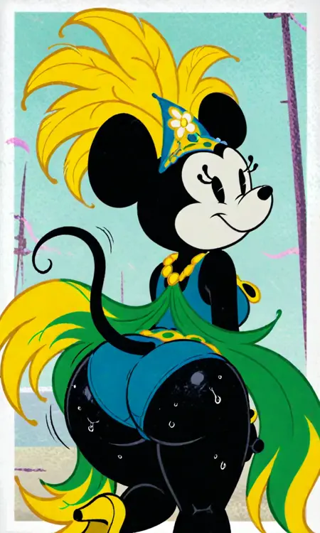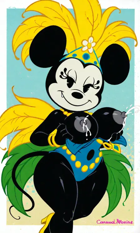 タグ: carnaval_minnie, 黒い毛皮, 白い顔, 黒いパックマン目, 黒い耳, 青いレオタード, 黄色いヒール, カーニバル・サンバ衣装, 色とりどりの羽の衣装, 黄色と緑の羽, エキゾチックな頭飾り, 装飾的なジュエリー