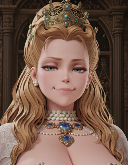 anarietta、金髪、長い髪、曲線的な体型、胸のほくろ、広い骨盤、巨大な胸、王冠、真珠のネックレス、成熟した女性(オプション)