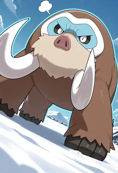 퍼럴: Mam0swine_Char, feral, pokemon_(creature), 네 다리, 짧은 다리, 둥근 몸체, 이색 털, 큰 상아, 검은 공막, 흰 눈