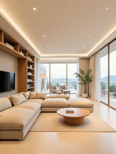 米色 - 极简主义室内设计,客厅配备低矮沙发、圆形茶几、嵌入式木制搁架、柔和的环境照明。