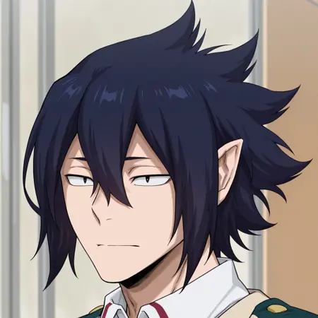 Tamaki Amajiki, hair between eyes, pointy ears, dark blue hair, black eyes
