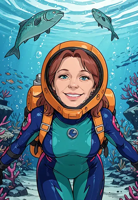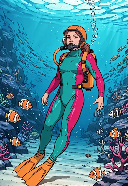 マゼンタとティールのウェットスーツ、茶色のショルダーストラップ、茶色の髪、オレンジのヘルメット、白いエアーホース、オレンジのスキューバタンク、オレンジのフィン