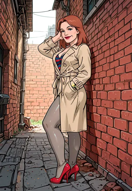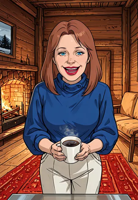 ヘレン・ベネット、年齢の線、茶色の髪、青い目、赤いリップ