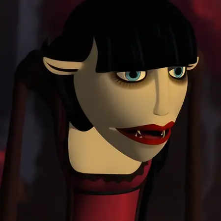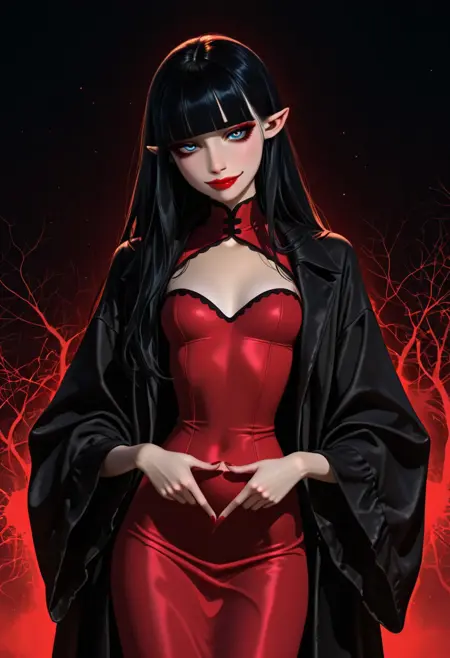 Countess Ruby, monster girl, vampire, pale-skinned female, long hair, black hair, blunt bangs, blue eyes, pointy ears, red lipstick, eyeshadow,
