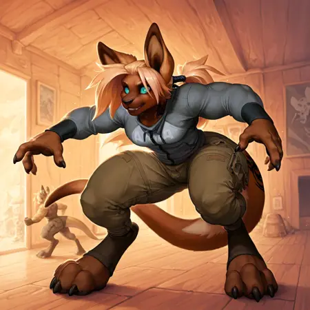 kori_graybourne, kangaroo, mammal, marsupial, anthro, macropod, tail, hair, tattoo, ponytail, claws, brown_body, brown_fur, muscular, blue_eyes, biped, blonde_hair, digitigrade, toes, paws, green_eyes, toe_claws, 3_toes, fingers, muscular legs, long_hair, wide hips, thick thighs,