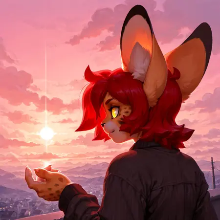 kami, mammal, hair, felid, domestic cat, red_hair, inner_ear_fluff, topwear, fur, black facial markings, big ears, gesture, yellow_eyes, tuft,,