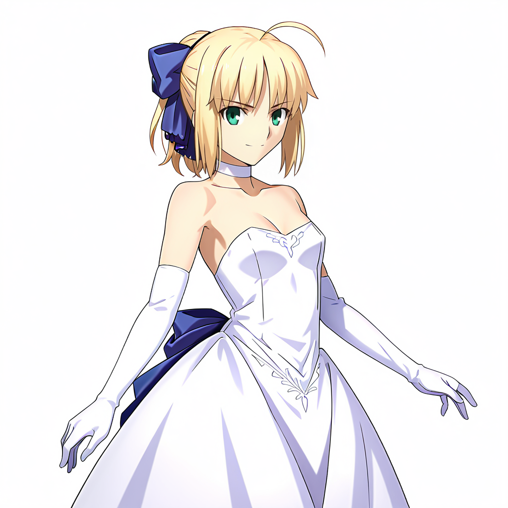 带白色礼服的触发词:SaberWedding, 1girl, artoria pendragon (fate), saber, 白色礼服, 肘部手套, 金发, 项圈, 小胸, 裸露肩膀, 头发蝴蝶结, 绿眼, 白色手套, 官方替代服装, 挺胸, 无肩带礼服, 牛仔镜头