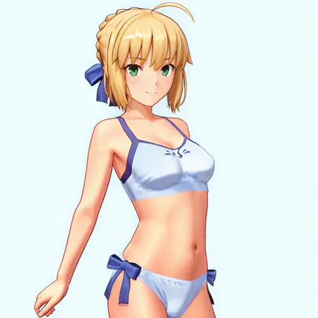 触发词:SaberBikini, 1girl, 泳装, 金发, 白色比基尼, artoria pendragon (fate), 绿眼, 中等胸部, 脐部, 吊带式, 挺胸, 头发丝带, 蓝色蝴蝶结, 短发, 蓝色丝带, 编发, 牛仔镜头