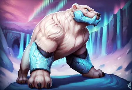 Etalus: etalus, polar bear, male, furry, white fur, blue eyes, gauntlets, ice jaw
