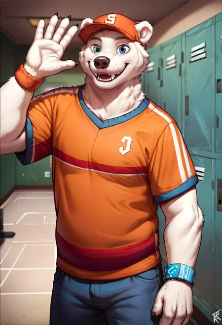 Lovers: etalusLovers, polar bear, male, furry, white fur, blue eyes, jersey, baseball cap, bracelet