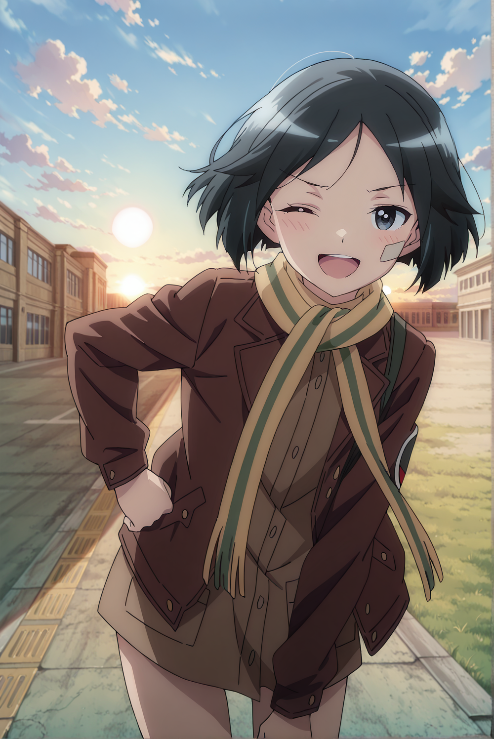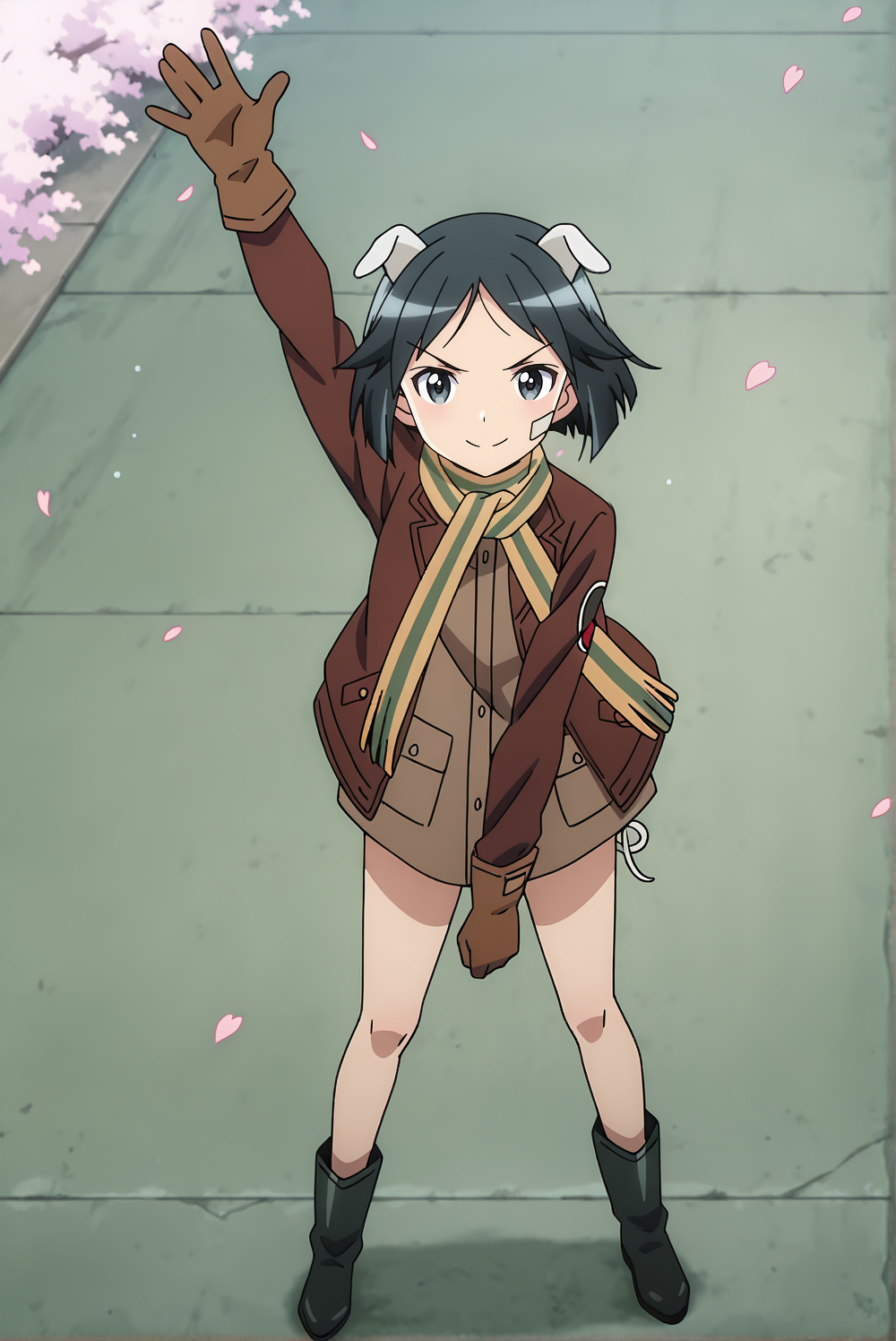 Outfit: naoe, def, 1girl, black eyes, black hair, short hair, bandaid, scarf, brown jacket, brown shirt, no skirt, gloves, boots