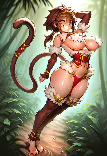 monkey girl, monster girl, monkey tail, monkey ears, leg fur, arm fur, chest tuft, chest fur, facial mark