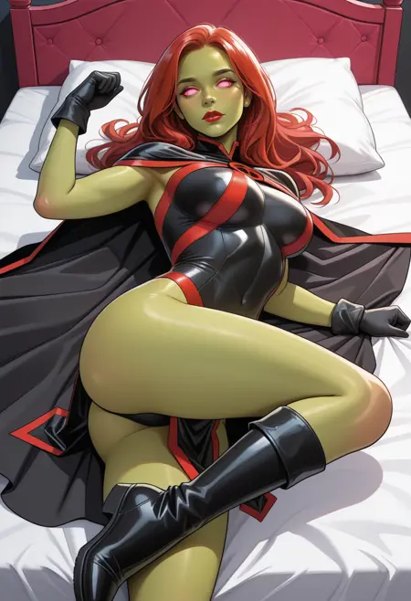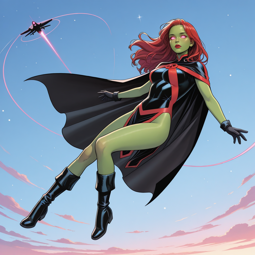 miss martian, M'gann M'orzz, green skin, long hair, red hair, cape, colored skin, leotard, black leotard, pink eyes, glowing eyes, no pupils, gloves, black footwear, boots, breasts, red lips, pelvic curtain, animification, flat colors