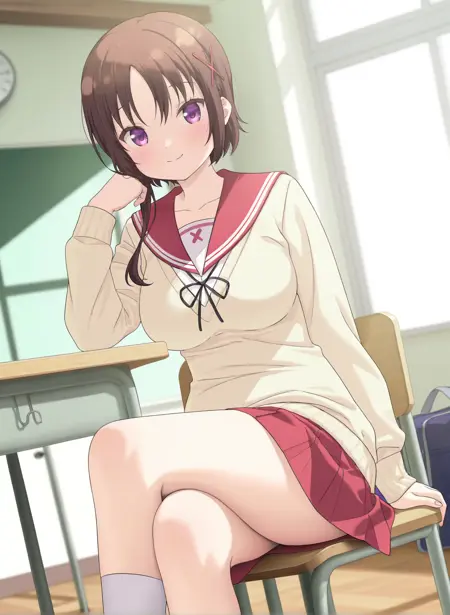学校制服, セーラー服, 赤いセーラー襟, 首リボン, 黄色いセーター, 赤いスカート, プリーツスカート, 白い靴下