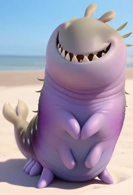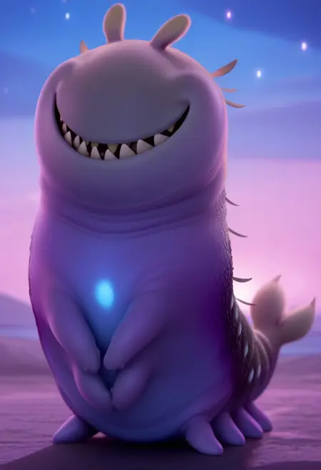 プロンプト:グロルゴン・エリオ、ソロ、1男、タデグレードのような宇宙人、人間なし、紫色の肌、目なし、鋭い歯、発光する青い斑点のある緑がかった黒い甲殻、尾、立ち姿