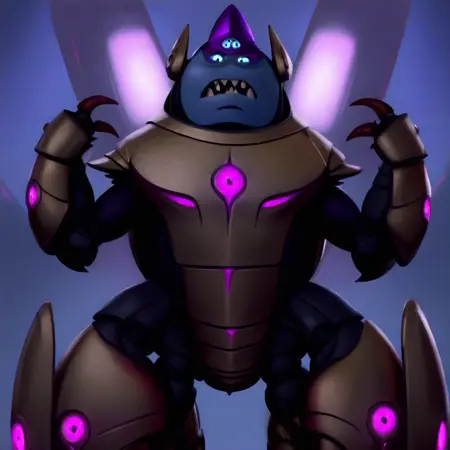 戦闘スーツ:グロルゴン・エリオ、ソロ、1男、鋭い歯、巨大でがっしりした蟹のような戦闘装甲、金色の装甲、紫色の肌、紫色のエネルギーが輝く金色の胸甲、四本の脚、金色のヘルメット、紫色のビジュア、青い白目を持つ3つのピクセル化された黒い目