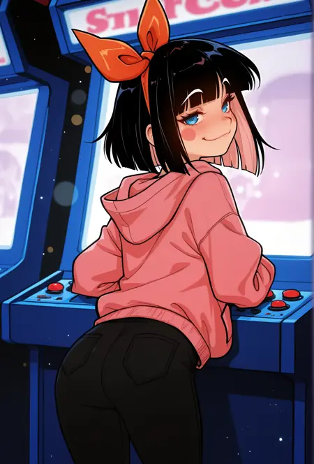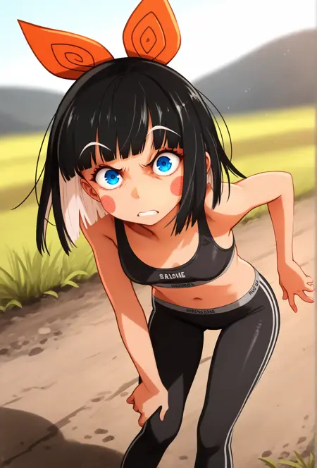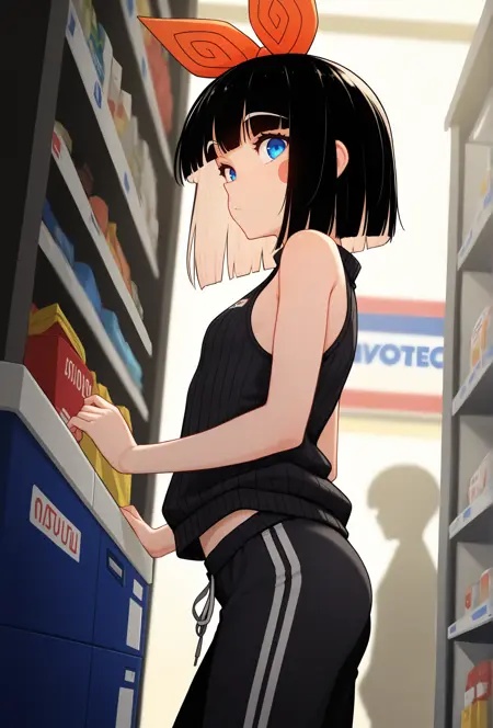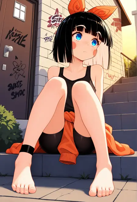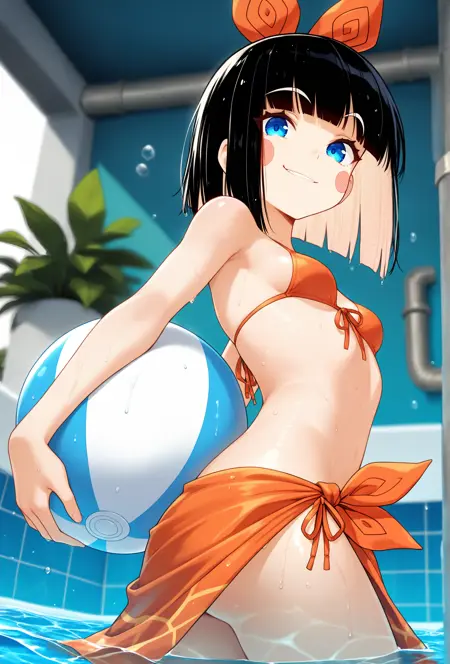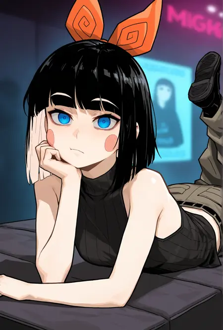 Trigger: sgchloe, black hair, blunt ends, blunt bangs, colored inner hair, blush stickers, blue eyes, orange bow, hair bow