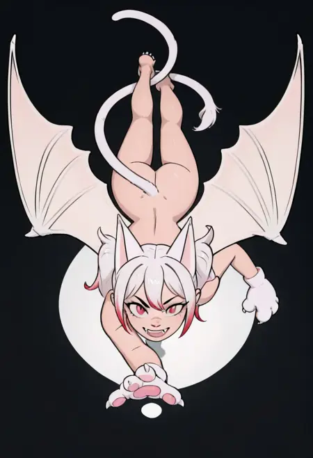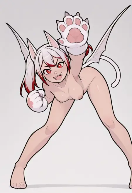 Saj1va, twintail hair, multicolored hair, white_red highlights, red tips, white bat wings, fangs, white animal claw gloves, white animal ears, long cat tail, completely nude, red eyes, uncensored, small breasts,