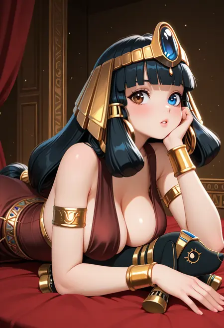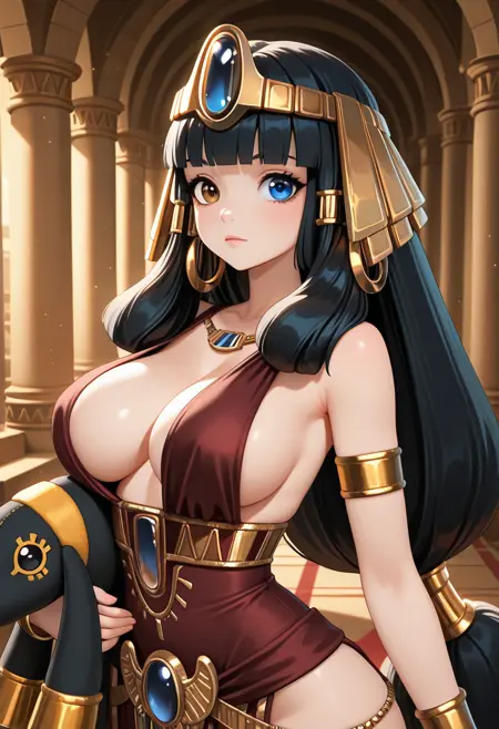 Trigger : nefertiti, black hair, low tied long hair, hair tubes, nefertiti_tiara, heterochromia, blue eye, brown eye, hoop earrings,