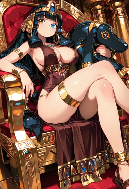 트리거: 네페르티티, 검은 머리, 낮게 묶은 긴 머리, 머리 튜브, 네페르티티 관모, 이방성 홍채, 파란 눈, 갈색 눈, 고리 귀걸이,