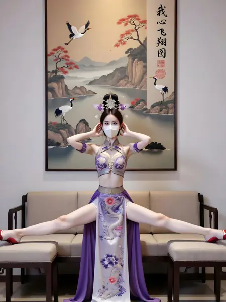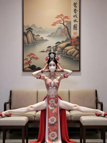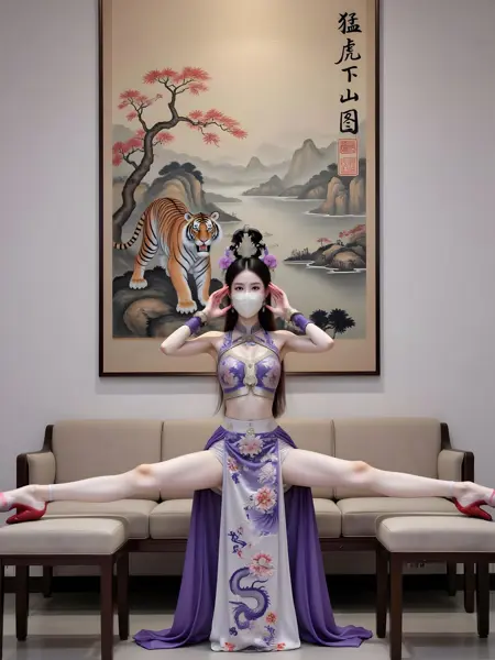 아름다운 전통 복장을 입은 여성이며, 정교한 머리장식을 착용하고 얼굴을 양손으로 가볍게 감싸고 마스크를 끼고 있다. 보라색과 흰색이 교차하는 긴 치마에는 정교한 용무늬와 꽃무늬가 수놓아졌으며, 금색 장식이 더해진 상의를 매치했다. 배경은 산수화로, 산과 강, 붉은 단풍나무가 그려졌고, 위엄 있는 호랑이 한 마리가 함께 있다. 산수화 오른쪽에는 서체로 “맹호하산도”라는 낙서가 쓰여 있으며, 고전적이고 우아한 분위기를 조성한다. 그녀는 밝은 색의 소파에 앉아 다리를 벌려 일자마 자세를 취하고 양쪽 의자 위에 발을 올려 놓았으며, 빨간 하이힐을 신고 있다. 전체적인 모습은 우아하면서도 동양적인 매력을 지니고 있다.