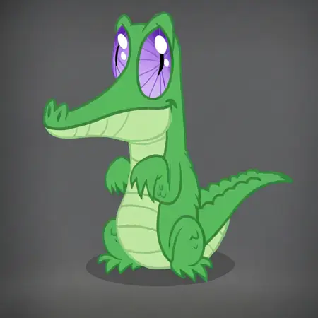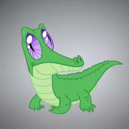 <lora: MLP: FIM - Gummy:1>, Gummy, ソロ, アンスロ・アリゲーター, フェラル・アリゲーター, 小型の爬虫類, 明るい緑色のウロコ, 淡い緑色の腹部, 短くて丸い鼻先, 大きな紫色の渦巻き状の目, 短い尾, ごつごつした足, 歯なし, 滑らかな体