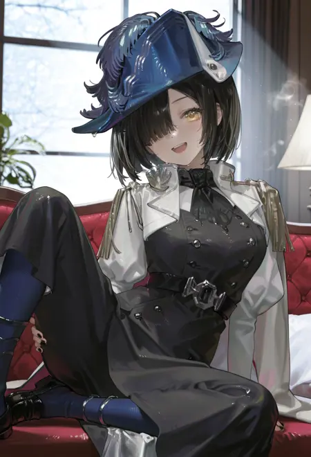 necrologist3, 1girl, solo, black hair, bob cut, parted bangs, hair over one eye, one eye covered, short hair, yellow eyes, black nails, blue hat, blue hat feathers, tricorne, black ascot, black dress, long dress, silver epaulette, white coat, open coat, coat on shoulders, long sleeves, juliet sleeves, anchor, black belt, gem, buttons, coat on shoulders, covered legs, leg ring, blue stockings, black loafers,