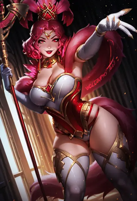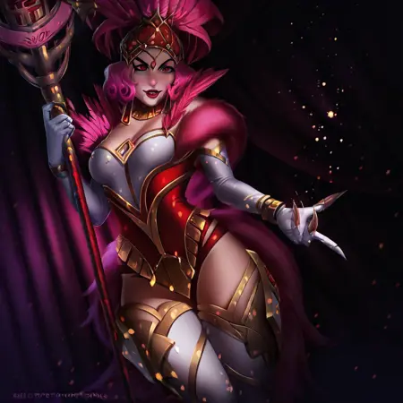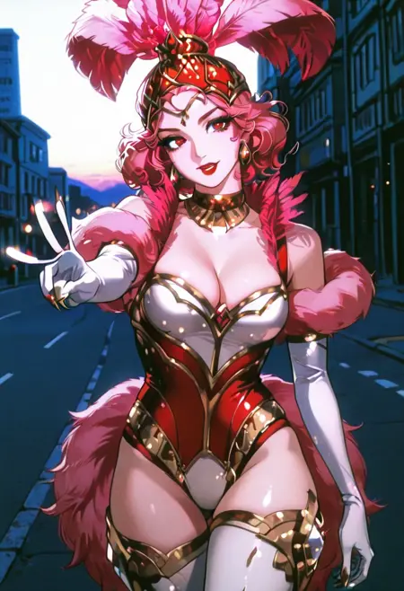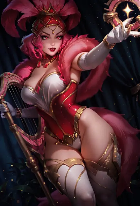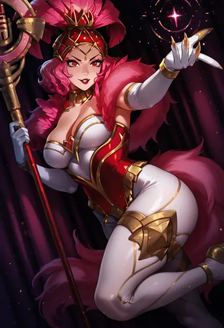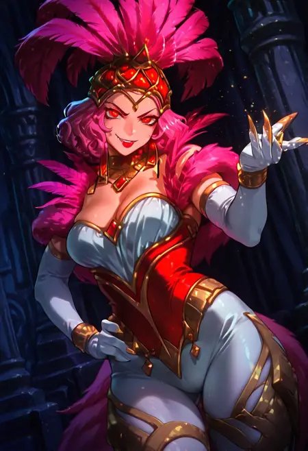 ShowstopperWhitemaneHoTS、1girl、solo、曲線的な体型、髪飾り、ピンクの羽のついた帽子、ピンクの髪、カールした髪、赤い目、厚い唇、メイク、赤いリップ、大きな胸、白い胸元、ピンクのファーのトリム、ピンクのコルセット、大きいお尻、太ももが太い、白いパンティーストッキング、白いエルボーグローブ、ジュエリー、靴、魔法の杖、ネックレス、イヤリング、黄金の爪、輝くドレス、