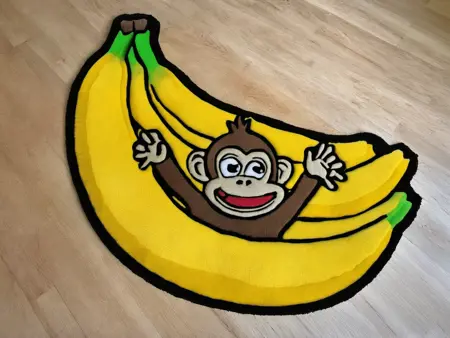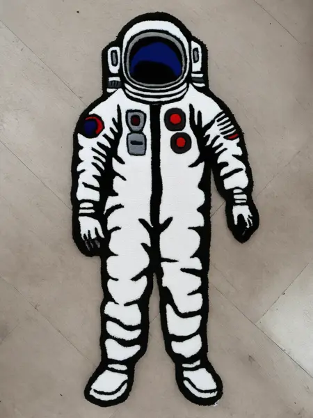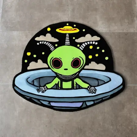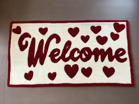 Is also capable of generating some basic text on the rug, try prompt like: "rug that says "Hello", with hearts on it, tufted rug style"