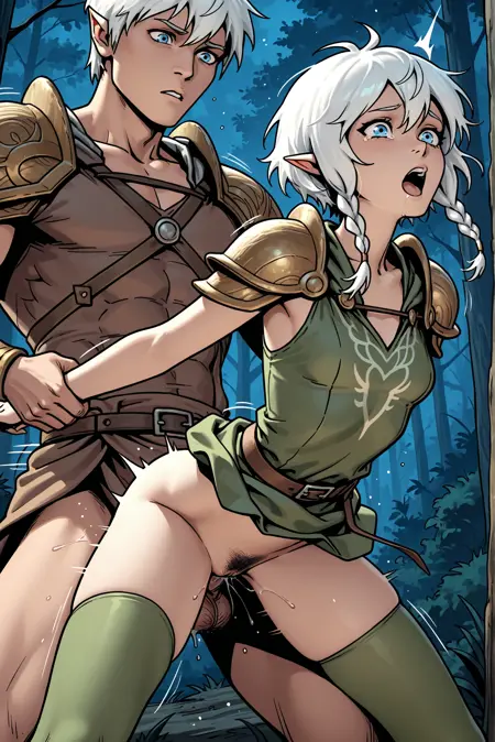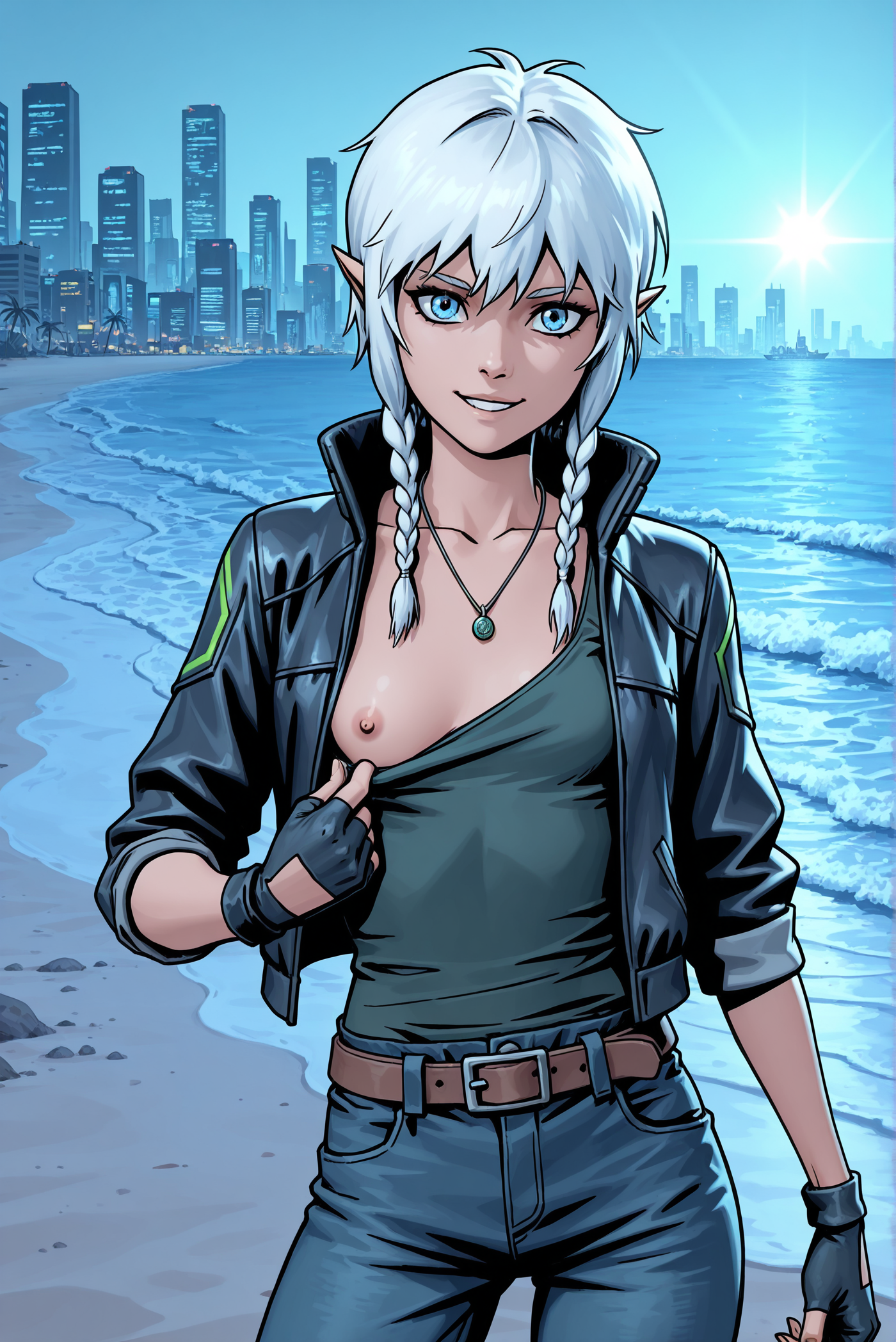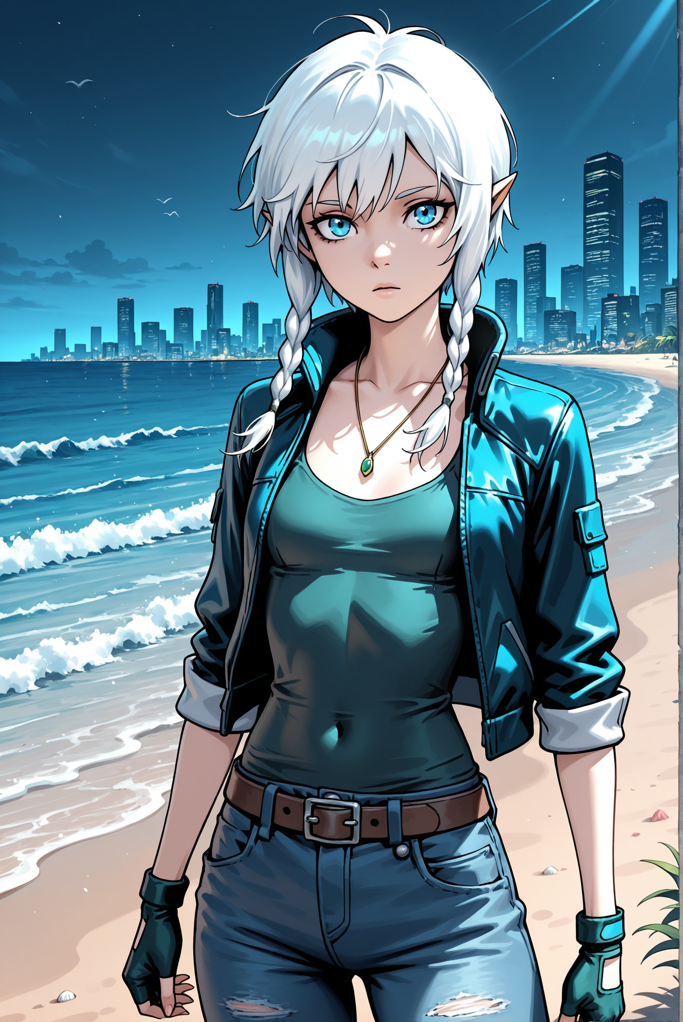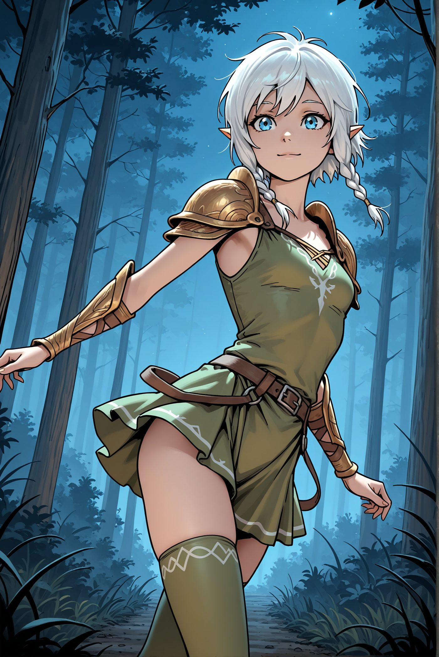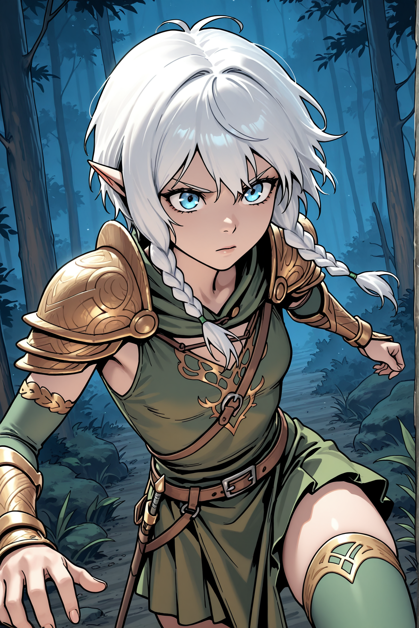 1girl, aewyn, pointy ears, white hair, twin braids, elf, short hair, small breasts, blue eyes,