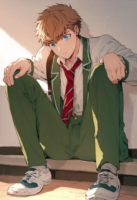 green school uniform, green pants, red necktie, white shirt,