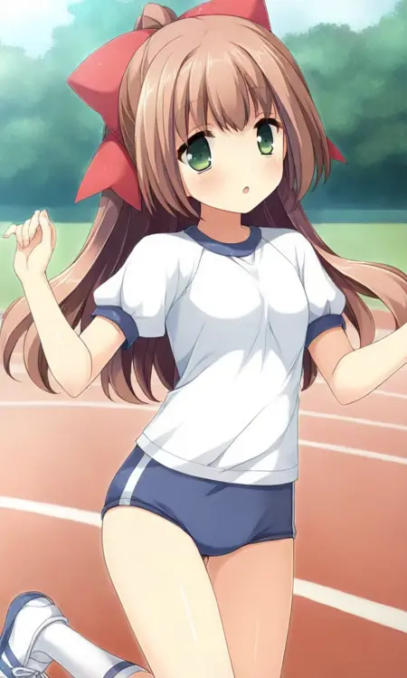 体操着:shindo meika, green eyes, long hair, brown hair, hair bow, short sleeves, red bow, sports uniform, white top, navy blue shorts, white socks, white shoes, bikini-style gym bloomers, gym bloomers resembling bikini bottoms,