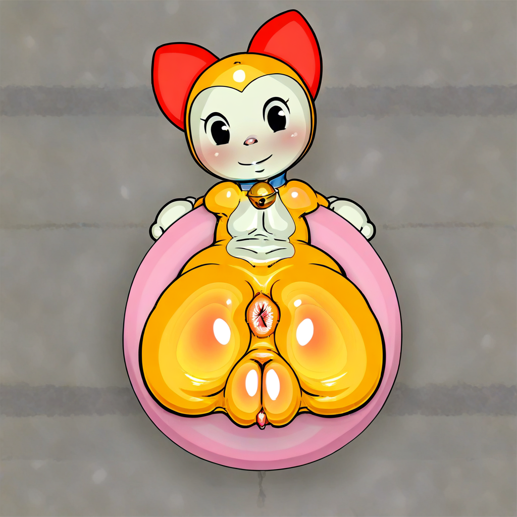 多拉米(A mines),1个女孩,脸红,铃铛,颈铃,微笑,铃铛,乳头,项圈,拟人化,红色丝带,短肢体,腹部口袋,黄色皮肤,白色皮肤,双色身体,双色头部,白色双手,白色双脚,圆手,大头,黑眼睛,粉红色鼻子,花朵尾巴,