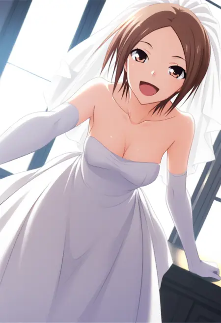 #azumi_majikoi,short hair, brown hair,brown eyes, wedding dress, veil, white gloves,gloves, bridal veil,elbow gloves,bare shoulders, collarbone, strapless dress, white dress