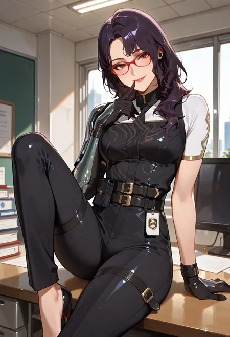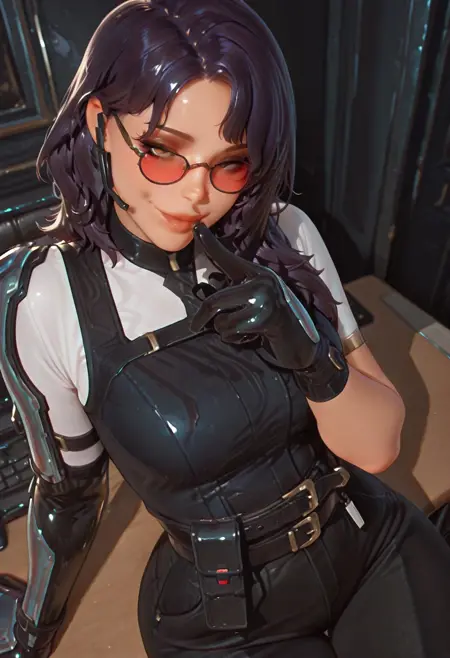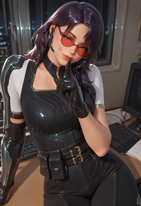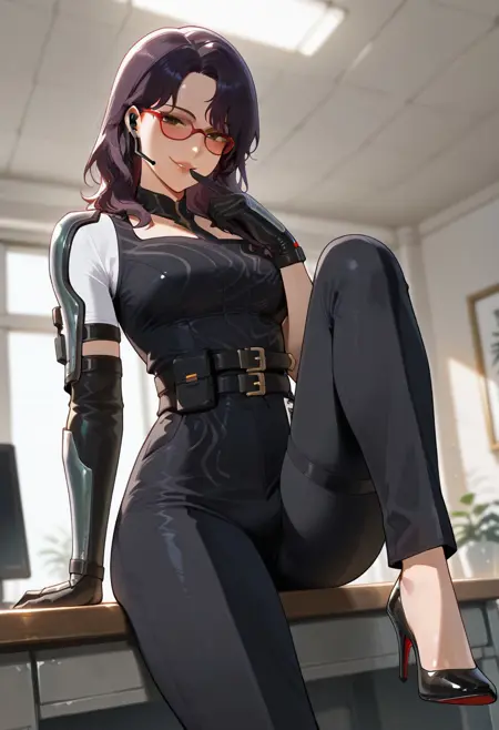 OnyxWinter, dark purple hair, brown eyes, red glasses, ear microphone, office suit, black top, white sleeves, armored arm, black leather gloves, belt, black pants, high heels