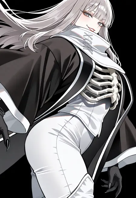 衣装:白い高めのカラー、骨、肋骨、黒い羽織、広い袖、黒い手袋、黒い爪、白いズボン。
