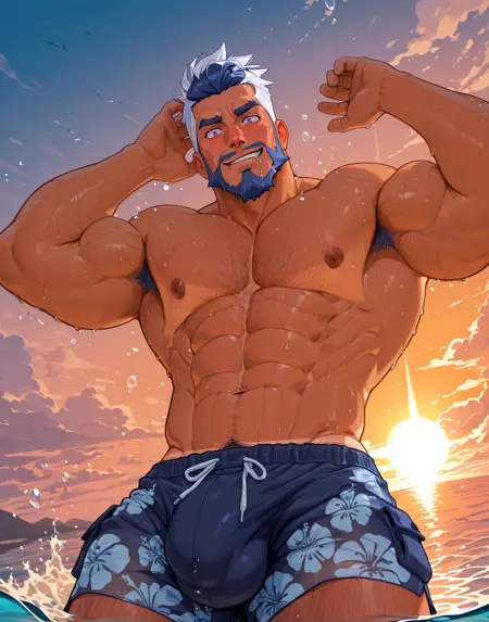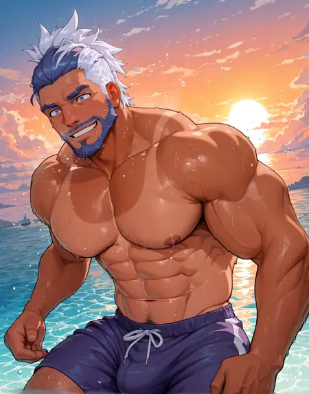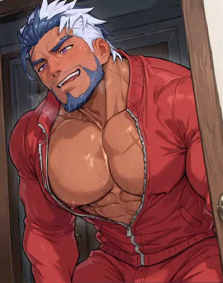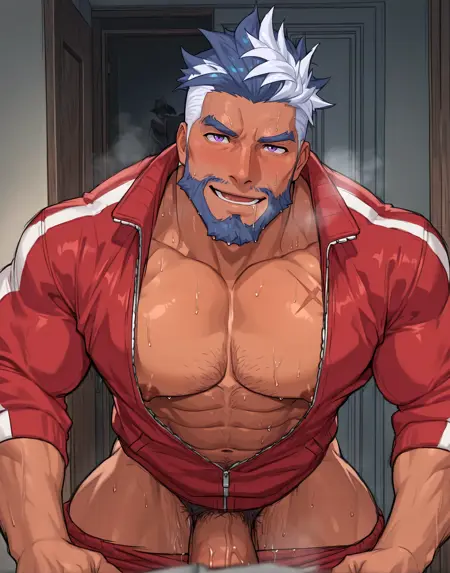 기본: 안면 털, 수염, 단발, 다색 머리카락, 얼굴 흉터, 콧수염, 보라색 눈, 이색 머리카락, 검은 피부 남성, 근육질 남성, 눈을 가로지르는 흉터, 두꺼운 눈썹, 뺨 흉터