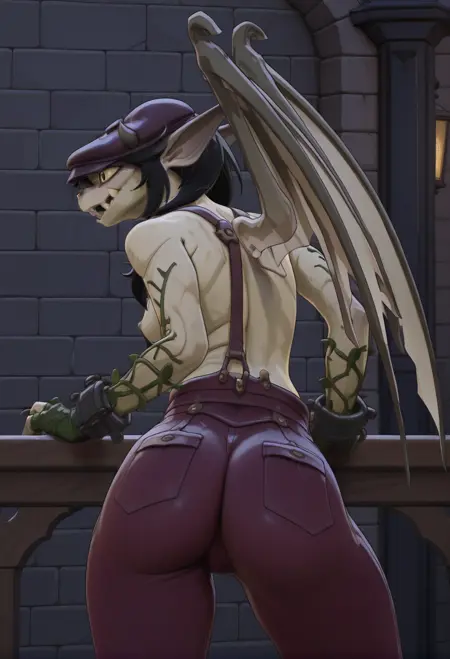 | 训练词汇 | Ivy, gargoyle girl, yellow eyes, yellow sclera, beige skin, horns, sharp teeth, fangs, pointy ears, wings, claws, black hair已复制! newsboy cap, purple headwear, horns through headwear, maroon pants, topless female, suspenders pants, suspenders, fingerless gloves已复制! |