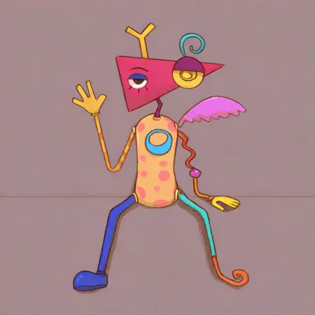"no mouth,triangle-haped head,asymetrical body,non-human,asymmetric antennas"