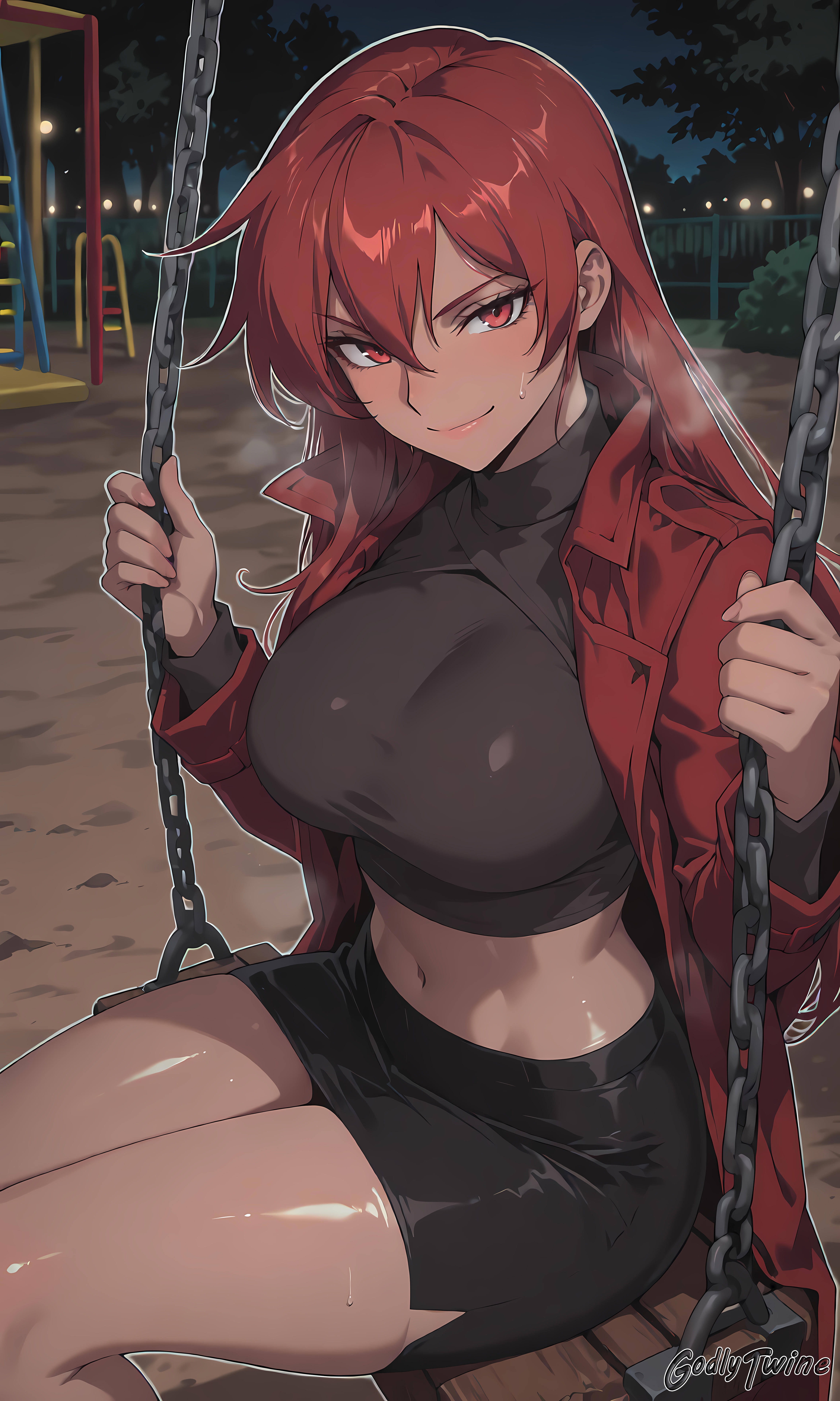Jishuka, red eyes, red hair, hair between eyes, red coat, black sweater, turtleneck sweater, midriff, black skirt, pencil skirt