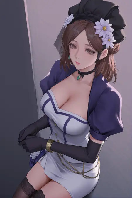 태그: veranair, 검은 헤어밴드, 초커, 팔찌, 흰 치마, 진한 갈색 눈, 보석, 검은 허벅지 스타킹, 베일, 팔꿈치 장갑, 머리 꽃, 머리 장식, 눈 밑 두더지, 볼륨감 있는 짧은 소매, 보라색 드레스, 갈색 머리, 검은 머리 장식, 검은 장갑, 갈라진 앞머리, 하이힐