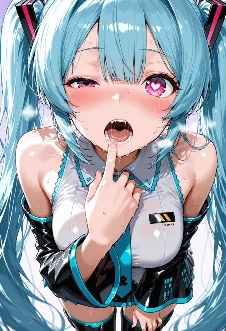 saliva, blush, looking at viewer, open mouth, sweat, drooling, heavy breathing, finger to mouth, breath, shiny, teeth, saliva trail,