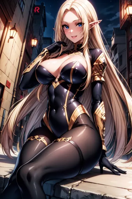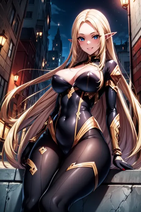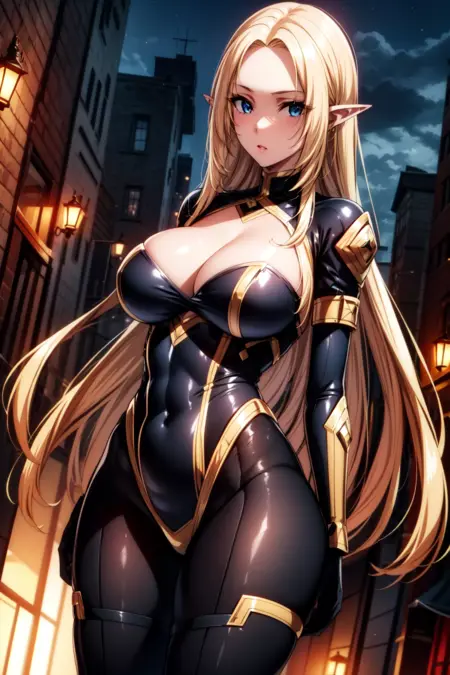 AlphaNDV, 1girl, blonde hair, blue eyes, large breasts, very long hair, elf, pointy ears, black bodysuit